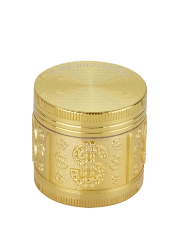 Grinder en métal avec 4 parties d'un diamètre de 40mm dont une partie avec un tamis afin de récolter le pollen de vos herbes préférées. Ce grinder de couleur dorée avec l'insigne du dollars gravé sur le côté du grinder.