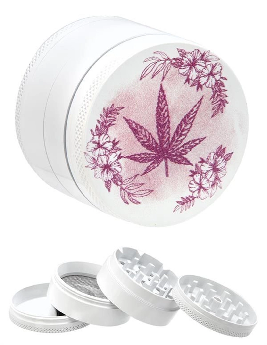 Grinder en métal de couleur blanc avec 4 parties dont une pour récolter le pollen de vos herbes. Sur le couvercle de ce grinder blanc, il y a une feuille et des fleurs de cannabis de couleur roses.
