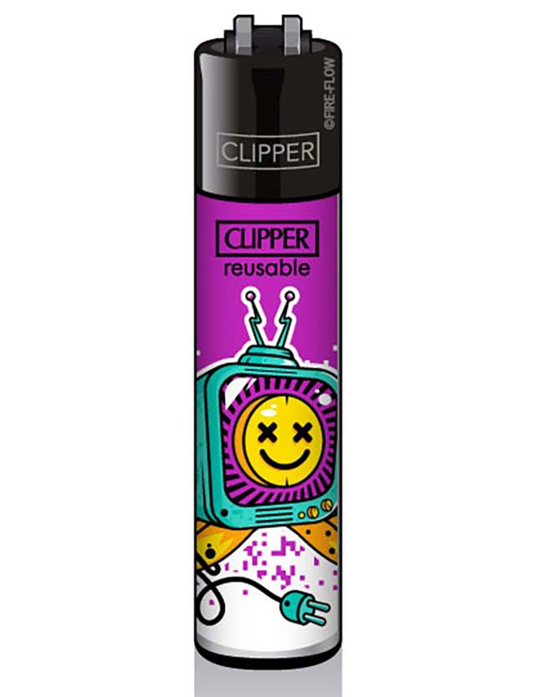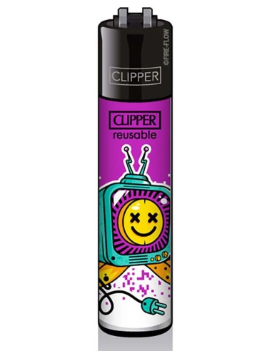 Briquet Clipper Trippy de couleur avec un poste de télévision une ecstasy smiley à l'écran et comme tous les Clipper, vous pourrez changer la pierre et recharger avec du gaz prévu à cet effet