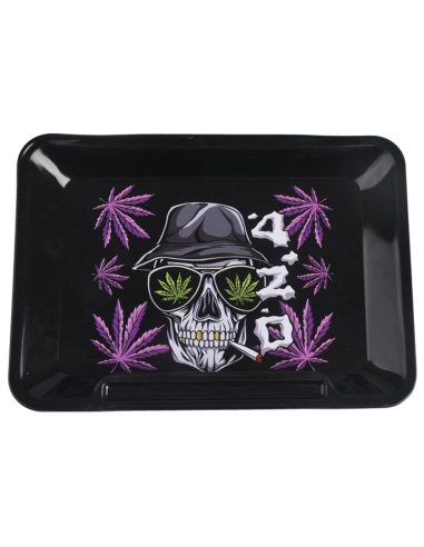 Plateau à mix de marque Wises Skies en métal de couleur noir ayant comme dimensions 14 x 18cm. L'image représente un crâne portant un chapeau, des lunettes et qui fume un joint.