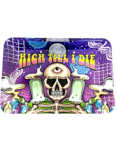 Plateau à mix de marque Wise Skies en métal d’une dimension de 14 x 18cm avec une image d'un squelette avec un bong fumant de chaque côté