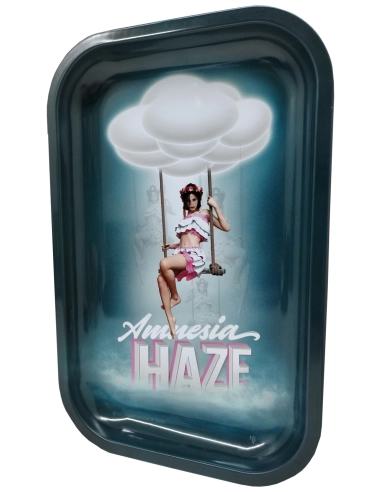 Plateau à mix en métal d'une dimension de 29 x 19cm avec sur le dessus miss Amnesia Haze assise sur une barre de trapèze. Ce plateau est très utile pour éviter de mettre de la mix partout lorsque vous roulez vos joints.