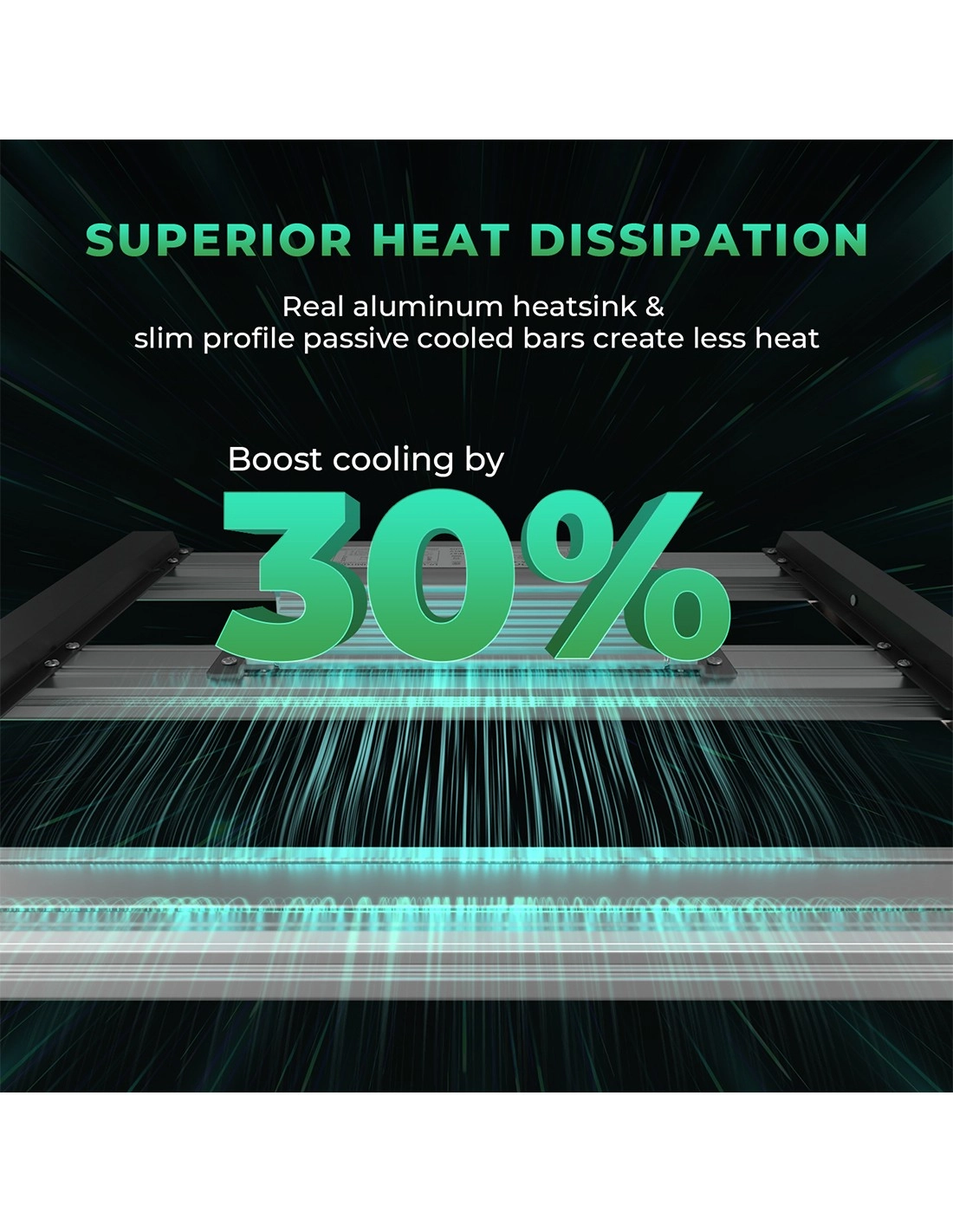 Elle consomme 150 watts avec un PPFD moyen 30 % plus élevé que les autres lampes de culture de même puissance, offrant une meilleure qualité de récolte et une meilleure rentabilité, et réduisant de 50 % la facture d'électricité
