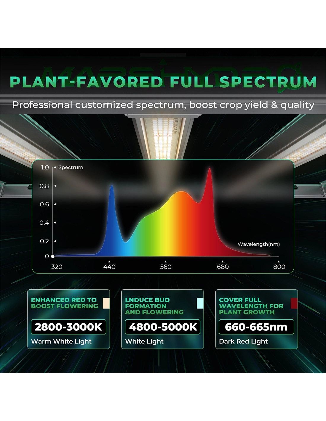 Ce panneau contient tous les spectres nécessaires pour une croissance vigoureuse et une floraison explosive avec un spectre Yield Max (660-665 nm, 2800k-3000k, 4800-5000k) qui se situe principalement dans la gamme PAR (400-700 nm)