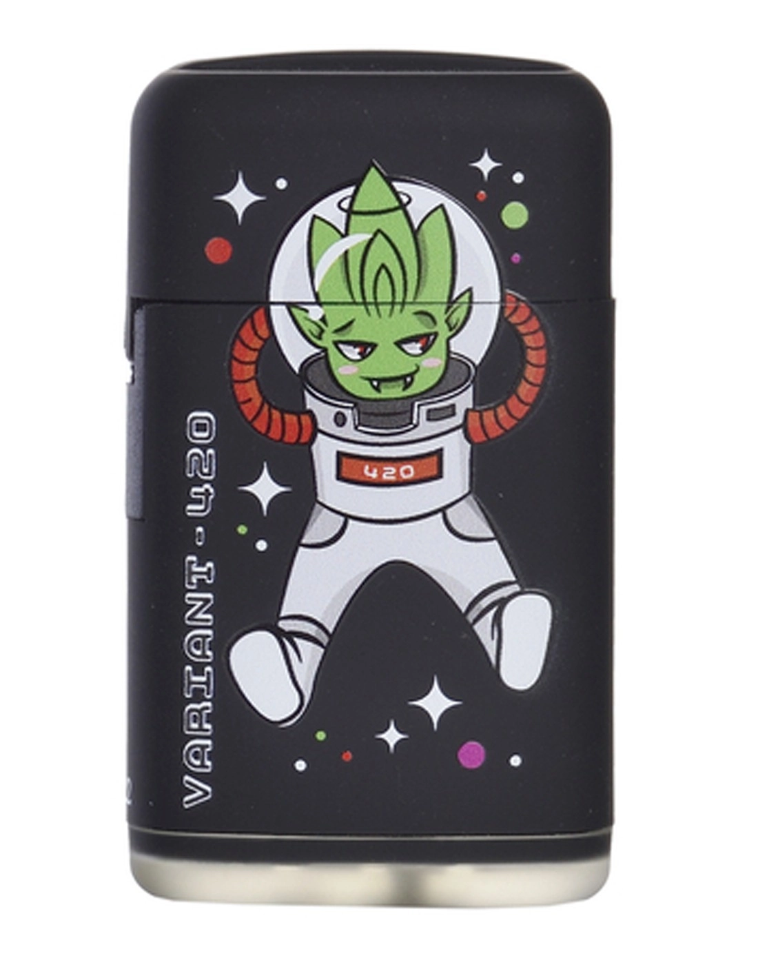 Briquet tempête de couleur noir avec un petit alien avec un scaphandre qui se détend avec l'inscription 420. Grâce à sa flamme bleue, vous pourrez utiliser votre briquet même par fort vent