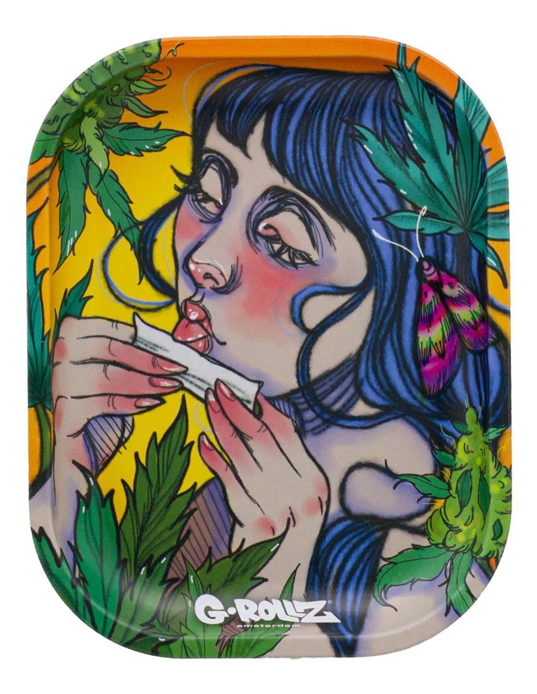 Plateau à mix en métal de la marque G Rollz d'une dimension de 14 x 18cm représentant une fumeuse qui roule un joint