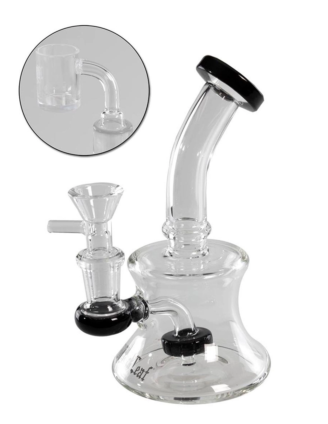 Petit bong de la marque Black Leaf avec des éléments décoratifs de couleur noir. L'intérieur du bong est muni d'un percolateur à tambour qui assure un refroidissement et un filtrage parfait.