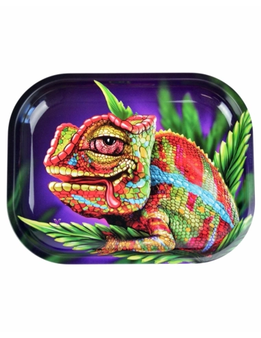 Plateau à Mix V Syndicate en métal avec un magnifique caméléon de couleurs sur le dessus. Ce plateau à mix sera très pratique pour éviter de mettre de la mix partout lorsque vous roulez un joint.