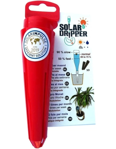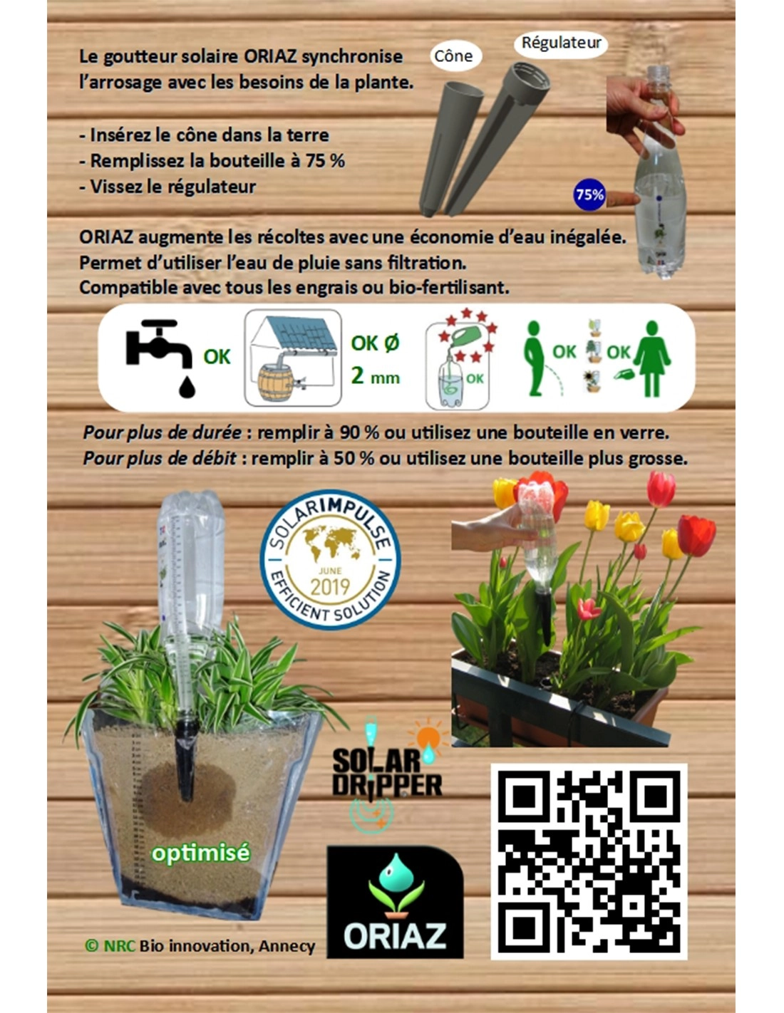 Le modèle XL rouge arrose 3 fois plus que le modèle standard noir Le goutteur solaire ORIAZ arrose selon les besoins de la plante. Il résiste au colmatage ce qui permet d'utiliser l'eau de pluie et tout types d'engrais classiques ou bio. La durée d'écoulement est d'environ 1 à 3 jours à l'extérieur. Compatible avec les bouteilles avec un goulot de 28mm en verre ou plastique ( type soda ou eau gazeuse).