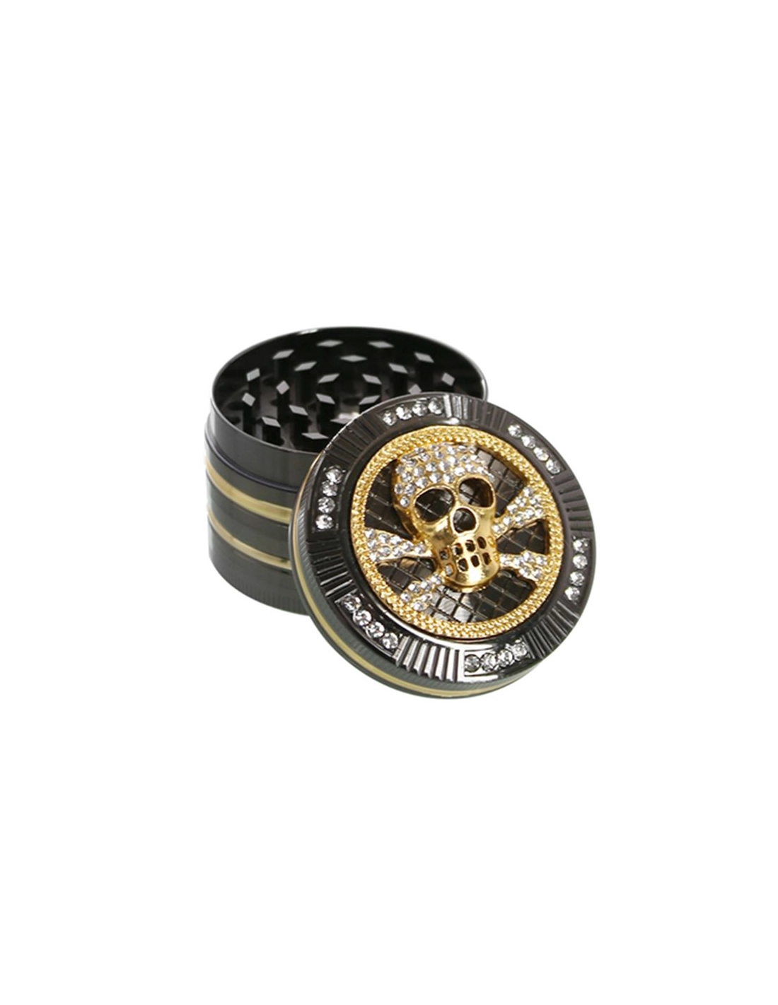 Grinder en métal anthracite d'un diamètre de 55mm avec une tête de mort dorée avec des strass. Ce grinder se compose de 4 parties dont une pour récolter le pollen.