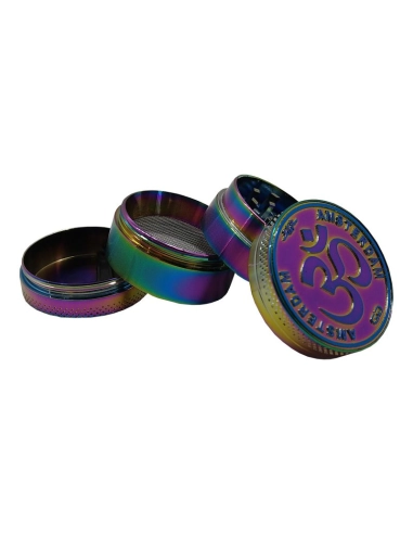 Grinder en métal de couleurs arc-en-ciel doté de 4 parties dont une pour la récupération de la résine de votre cannabis CBD avec l'image d'un ohm