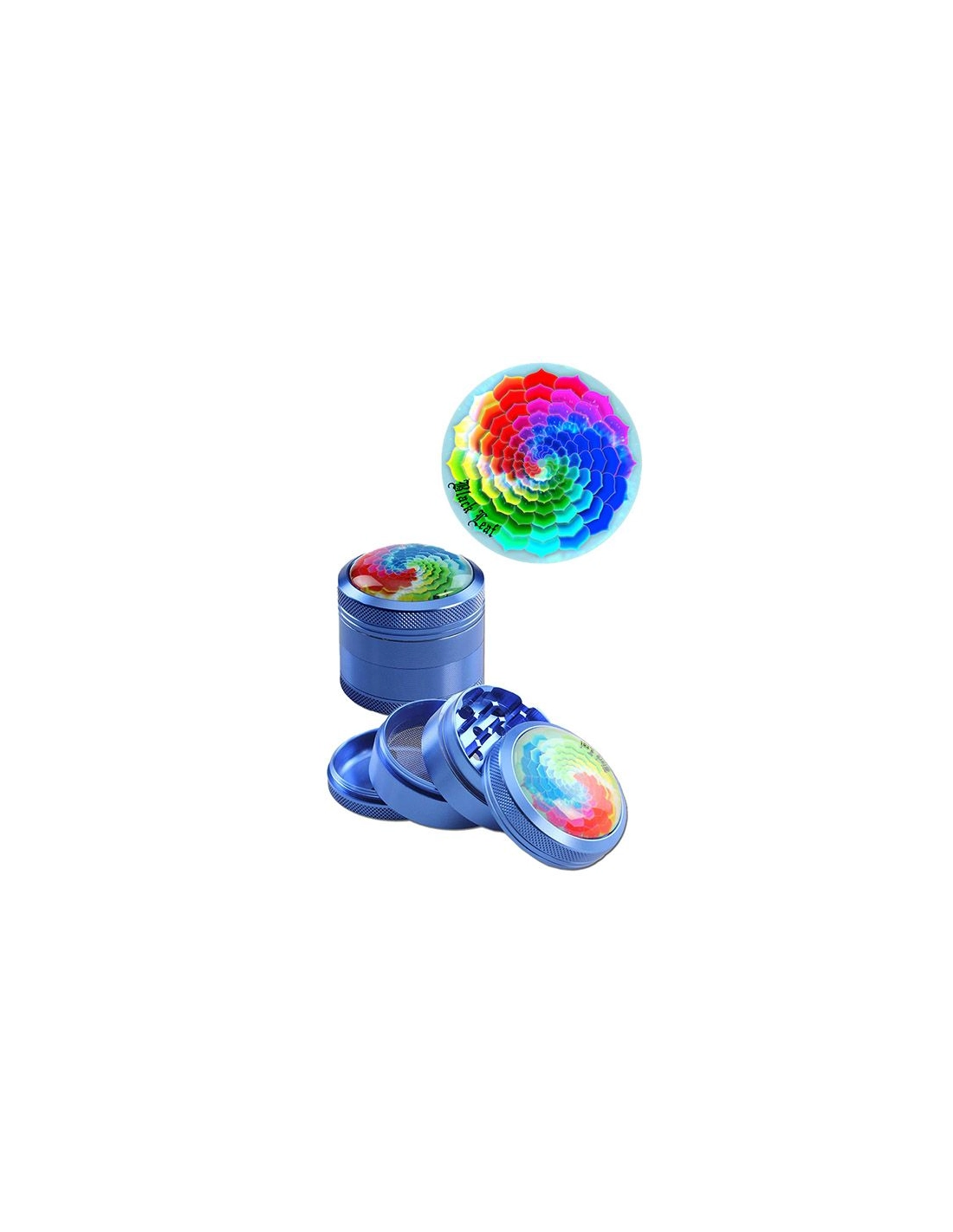 Grinder en métal 4 parties avec un diamètre de 50mm de couleur bleu avec un tamis permettant de récolter la résine de CBD en dessous. Ce grinder de couleur bleu avec une pastille avec un mandala de couleur sur le dessus.