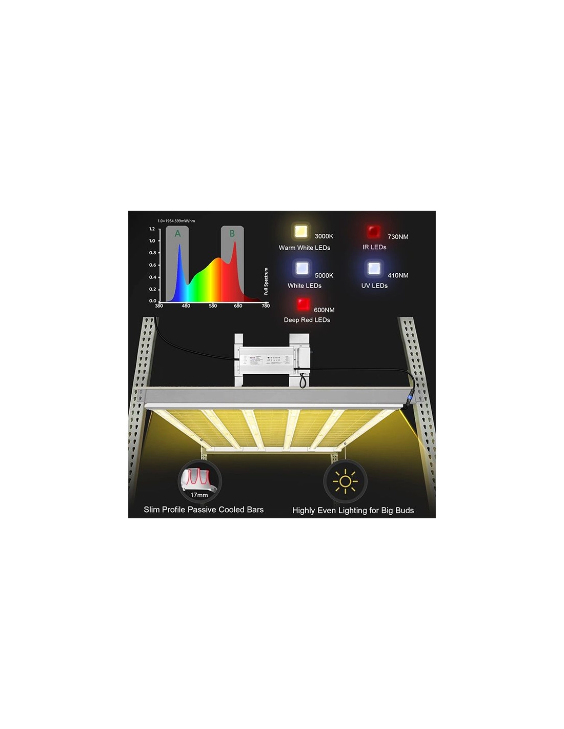 - Spectre: 380-410nm 660-665nm 730-740nm 2800-3000K 4800-5000K