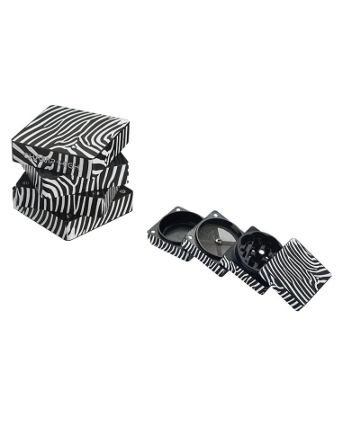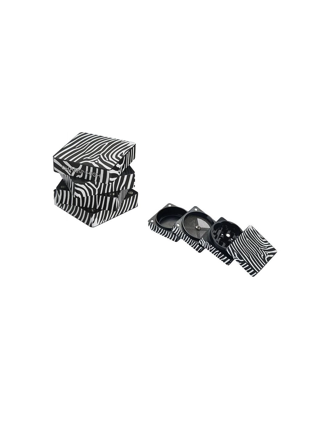 Grinder en 4 parties avec un diamètre de 50mm Champ High en forme carrée et coloré comme un zèbre. Ce grinder comporte également un tamis qui permet de récolter le pollen de votre herbe CBD.