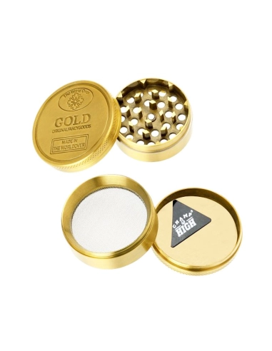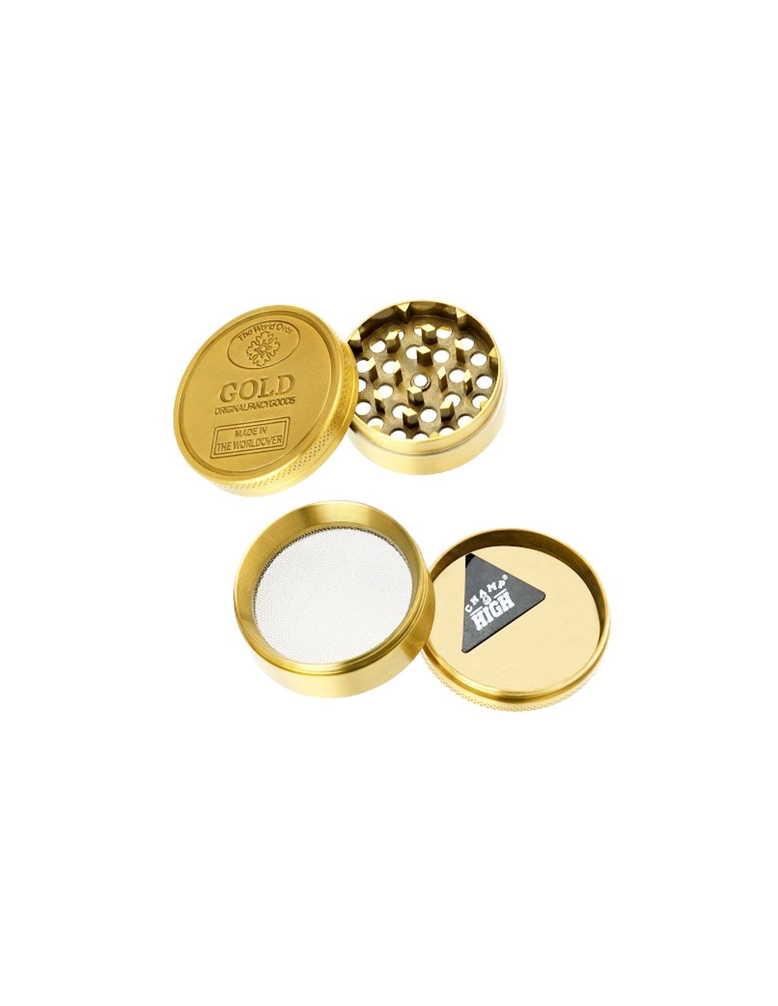 Grinder en métal doré comme un lingot de marque Champ High avec un diamètre de 50mm et comporte 4 parties dont une avec un tamis qui vous permets de récolter le pollen de votre CBD préférée