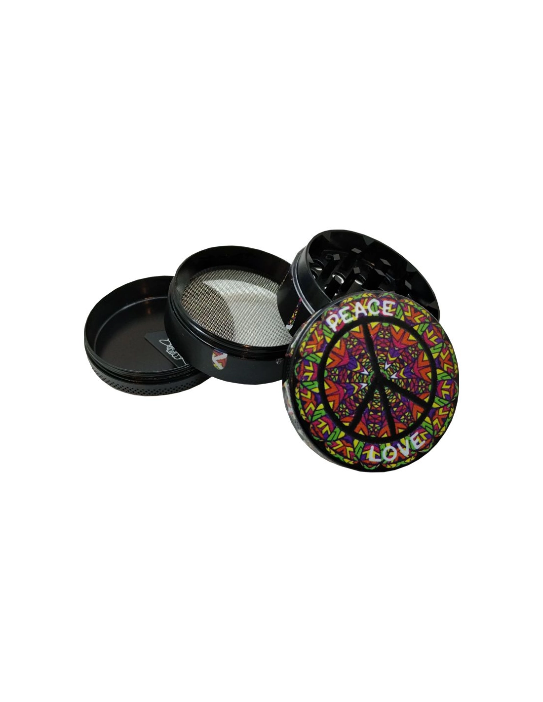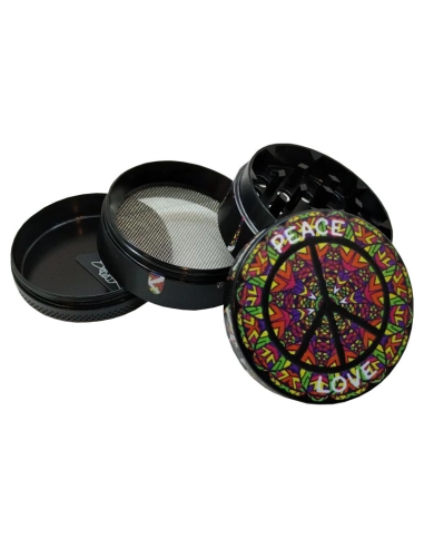 Ces grinder de couleur noir ont un peace and love stylisé et coloré