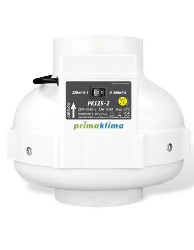 Extracteur d'air de marque Prima Klima avec un diamètre de 125mm et comprenant deux vitesses 220-360m3. Cet extracteur est parfait pour les espaces de culture en intérieur.