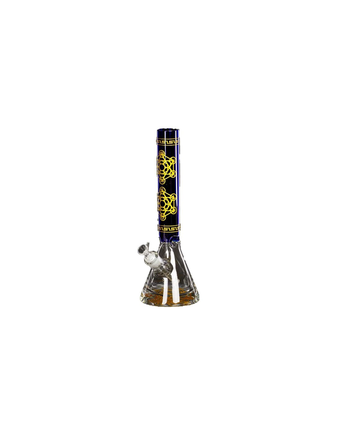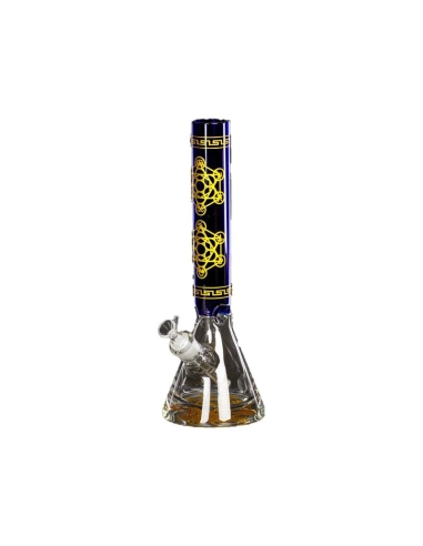 Bong en verre avec une base renforcée de 22mm et faisant 40cm de hauteur. La base du bong est transparente et le haut du bong est bleu avec des formes géométrique.