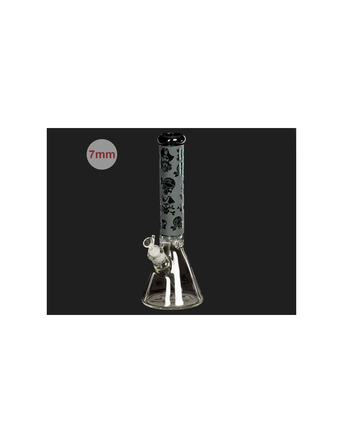 Bong d'une hauteur de 37cm avec une partie transparente et le haut de couleur vert avec des crânes pirates. Grâce à ce bong de 7mm d'épaisseur vous aurez entre les mains un bong très résistant.