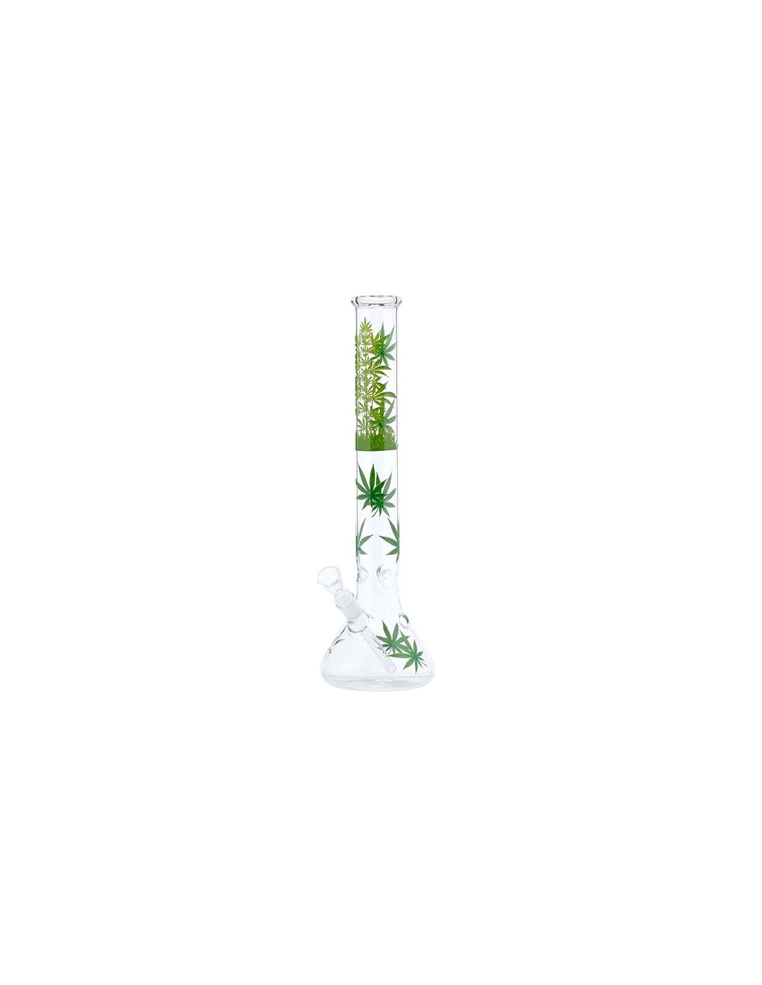 Bong en verre d'une hauteur de 45cm avec des feuilles de cannabis sur le dessus. Le foyer ou vous mettez votre CBD à un diamètre de 18.8mm vous permettant un tirage aérien.