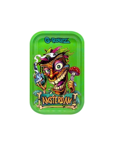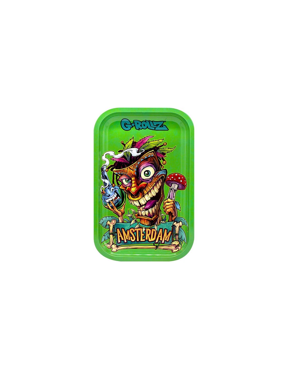 Plateau à mix en métal G Rollz de couleur verte avec l'image d'une créature tenant un bong et un champignon hallucinogène d'une dimensions de 17.5 x 27.5cm avec les bords arrondis.