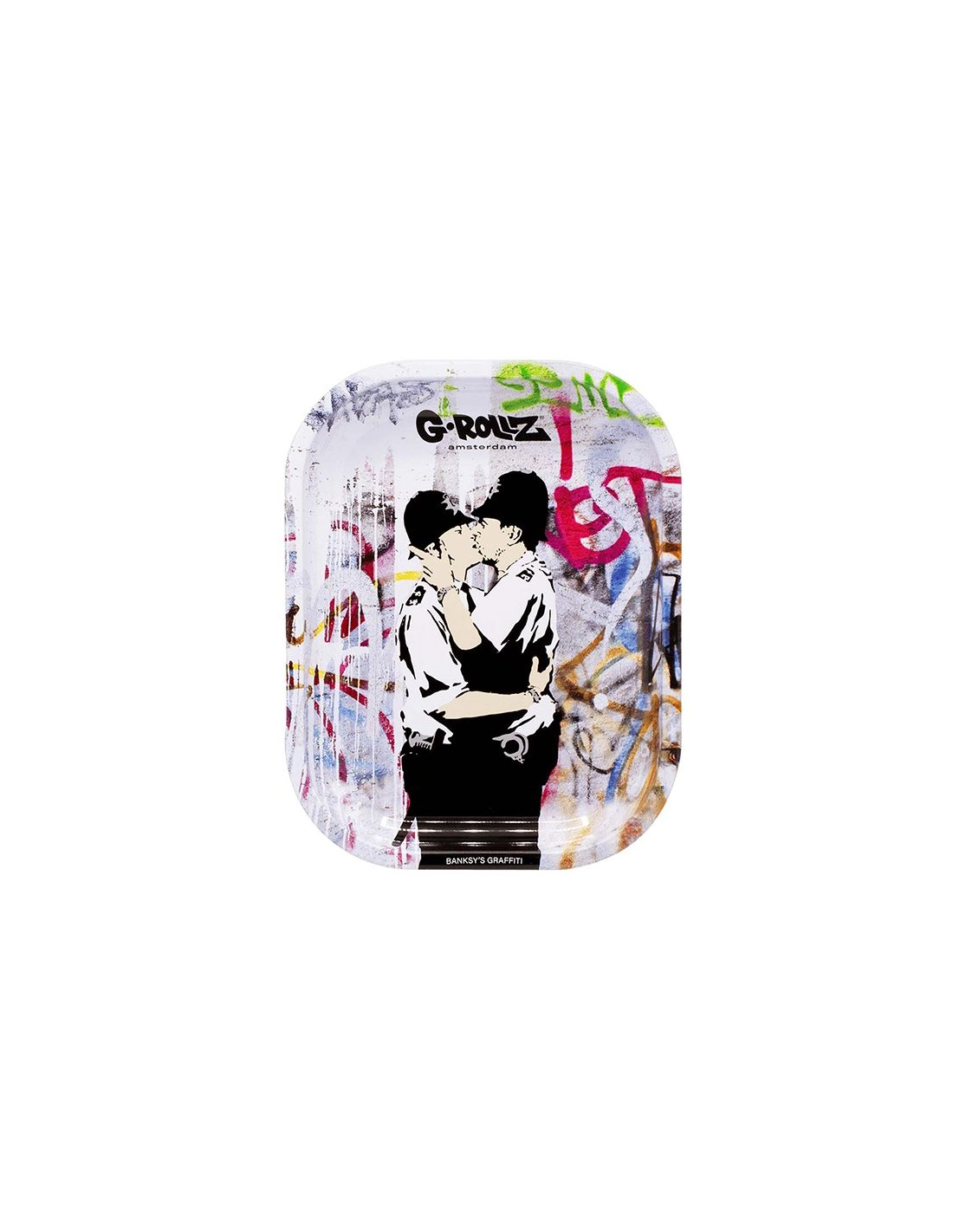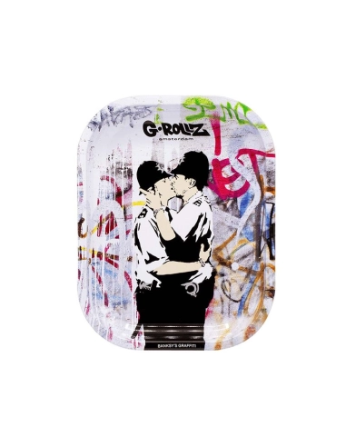 Plateau à mix en métal d'une dimension de 14 x 18cm avec l'image d'une oeuvre de Banksy qui représente deux policiers qui s'embrassent