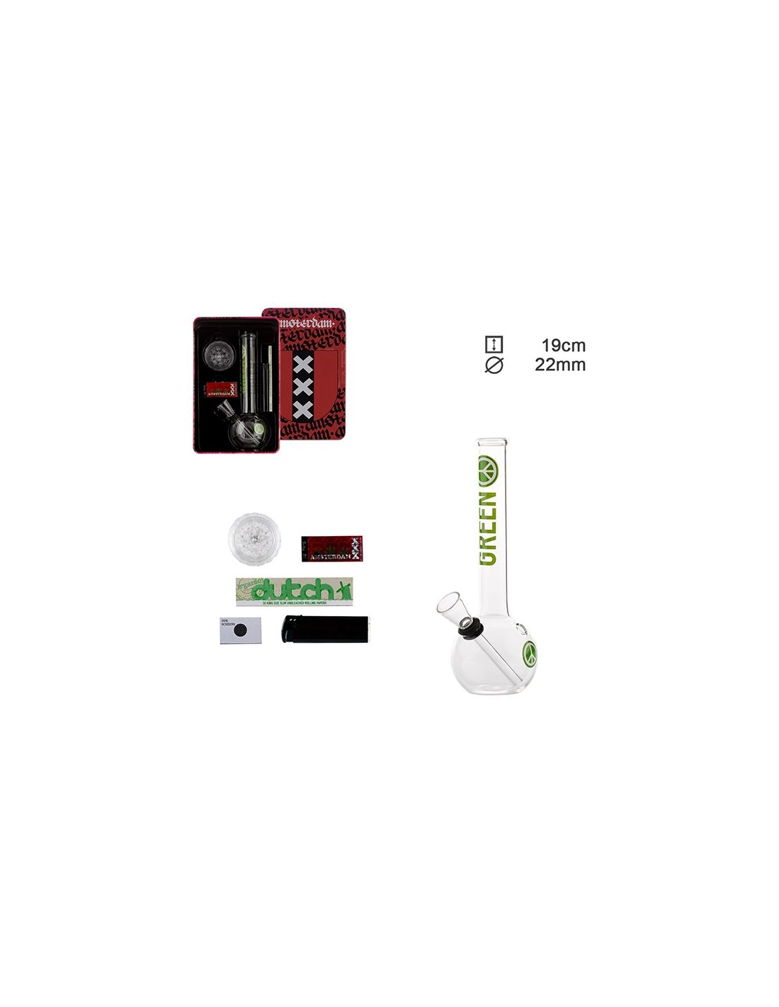 Coffret cadeau avec un bong d'une hauteur de 19cm et des accessoires idéàl pour fumer votre CBD préférée. Ce bong utilise un foyer avec un diamètre de 14.4mm et d'une épaisseur de 3mm.