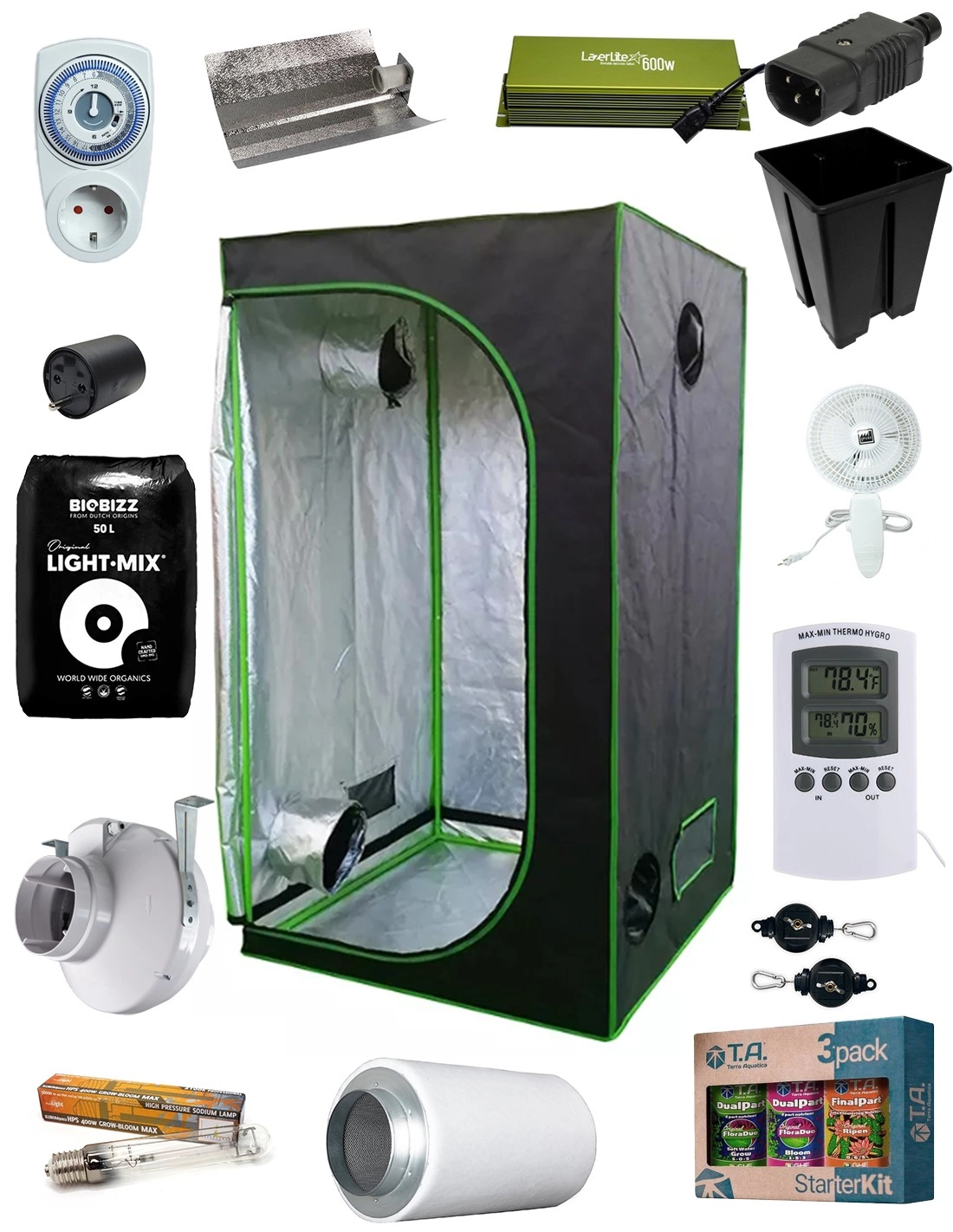 Kit de culture complet avec box Black Room 100 de 100 x 100 x 200cm avec ballast électronique réglable sur 250-400-600W. L’offre comprend tout le matériel nécessaire pour une culture en intérieur réussie, avec 16 pots de 3.6lt.