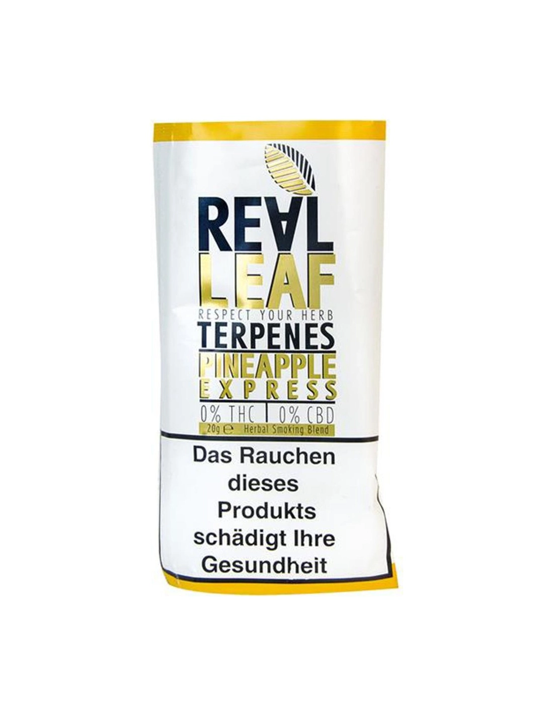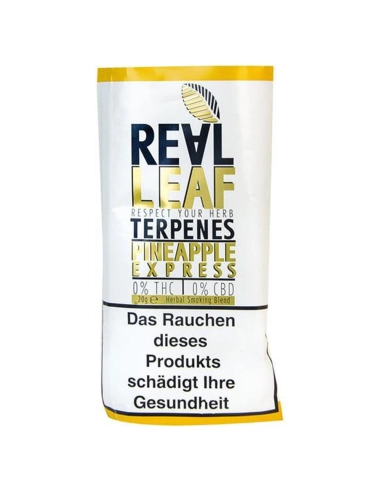 Le substitut de tabac REAL LEAF Pineapple Express avec Terpènes est un mélange unique de plantes sans tabac et sans nicotine, enrichi de Terpènes Pineapple Express.