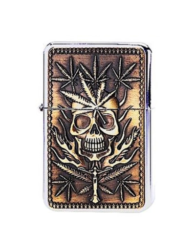 Briquet à essence en métal de couleur dorée avec un crâne enfoncé sur une épée et des feuilles de cannabis décoratives. Pour faire fonctionner ce briquet, vous aurez besoin d'essence acheter essence Zippo