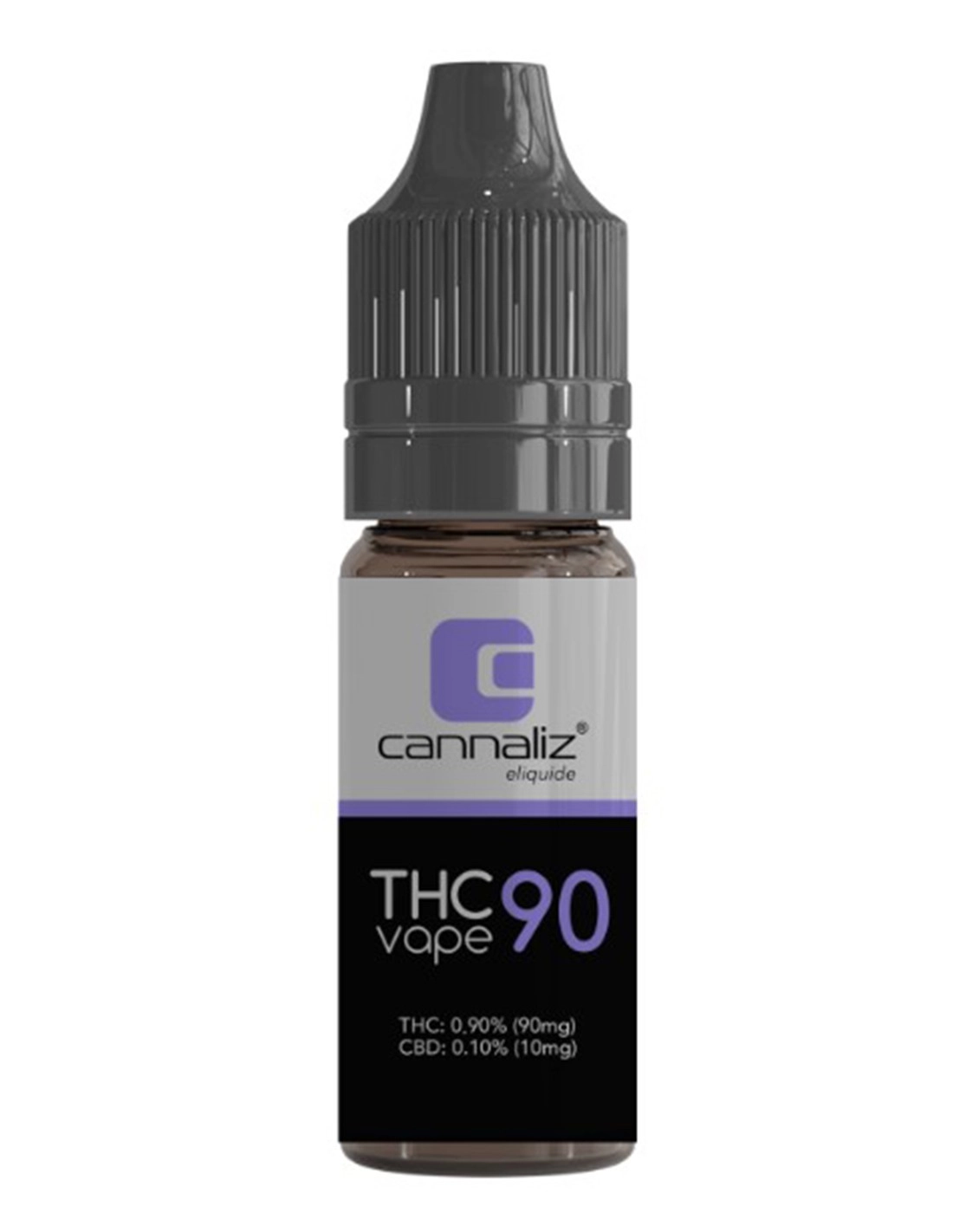 Cannabis THC Vape Eliquid 90 mg, Inhalt 10 [ml], mit ca.* 0,9 % THC und 0,1 % CBD (Cannabidiol), hergestellt aus Bio-Cannabis-Sativa-Extrakt aus der Schweiz.