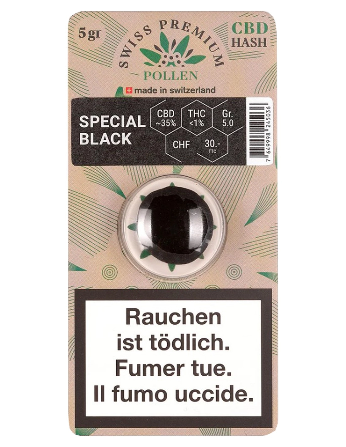 Der Anblick des Special Black von Swiss Premium ist einfach schön. Und weckt die Neugier, wie er schmeckt. Der Special Black wird aus Outdoor-Blüten gewonnen, präsentiert sich tiefschwarz und ist sehr harzig.