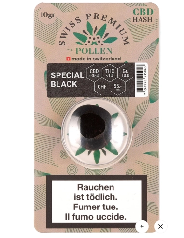 Unser Special Black ist ein Pollen, der sich in die Reihe unserer harzigen Pollen einreiht. Er ist außen wie innen recht dunkel und wird Liebhaber von reichhaltigen Harzen glücklich machen. Dieser Pollen ist wunderbar harzig und fett, außen etwas fest und innen weich. Er besitzt einen herrlich würzigen Geruch, der beinahe an Schokolade erinnert. Unser Special Black mag zwar kräftig und würzig sein, aber seine Feinheit und seine Süße sorgen für unvergleichliche Harmonie. Genau das Richtige für die Feinschmecker unter Ihnen.