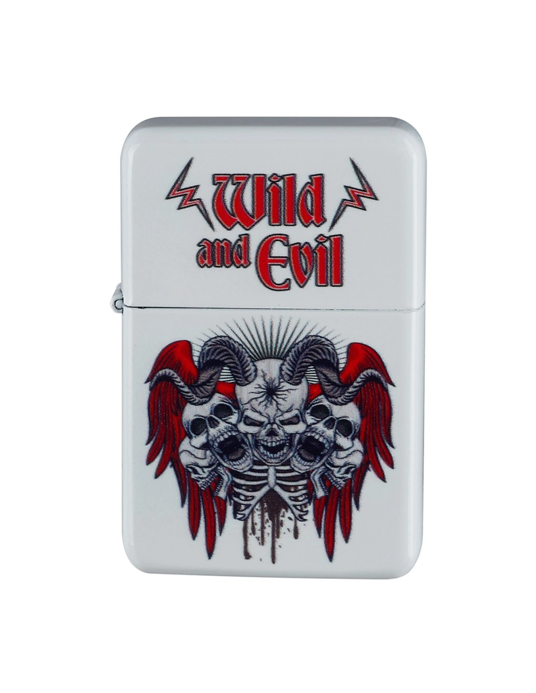 Benzinfeuerzeug aus Metall in weißer Farbe mit den Aufschriften Wild and Evil und Totenköpfen mit Hörnern und Flügeln. Um dieses Benzinfeuerzeug zu verwenden, benötigen Sie Zipperbenzin.