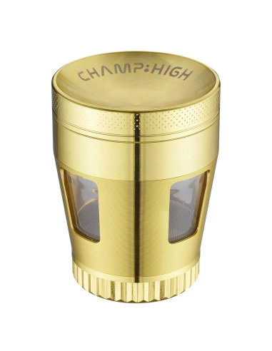 Grinder aus Metall der Marke Champ High in Gold mit einem Fenster, um den Grasstand zu überprüfen. Der Deckel kann als Mini-Aschenbecher oder Mischschale verwendet werden. Dieser 50 mm hohe Grinder unterscheidet sich durch seine spezielle Form von anderen Modellen. Er besteht aus 4 Teilen und ist mit einem Sieb ausgestattet, das die Pollen Ihrer Lieblingskräuter optimal filtert.