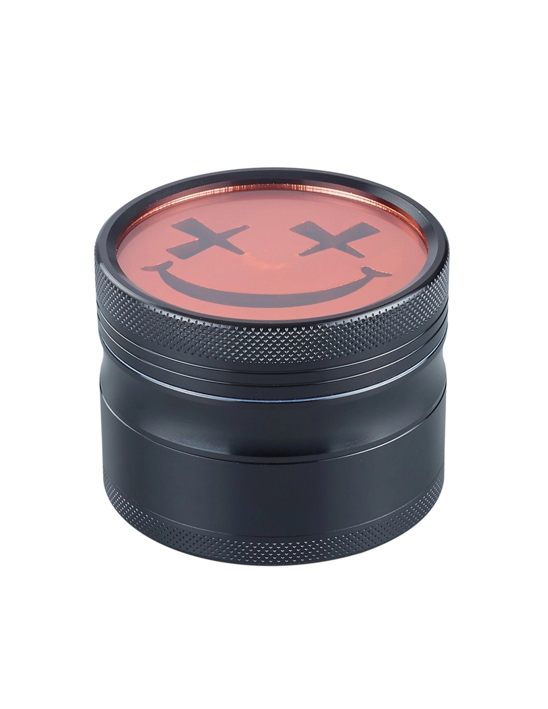 4-teiliger Grinder aus Metall mit einem Durchmesser von 63 mm und einem Sieb, um den Pollen deiner Lieblingskräuter aufzufangen. Dieser Grinder besitzt einen durchsichtigen Deckel, der mit einem roten Smiley verziert ist.
