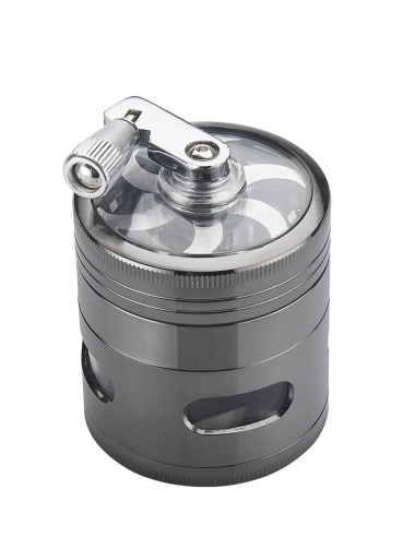 Ein vierteiliger Grinder aus schwarzem Metall mit Sieb der Marke Champ High. Dank des durchsichtigen Sichtfensters, kann man zusehen, wie die eigenen Lieblingskräuter fein zerkleinert werden. im Gegensatz zu anderen Grindern verfügt dieses Modell über eine praktische Handkurbel.