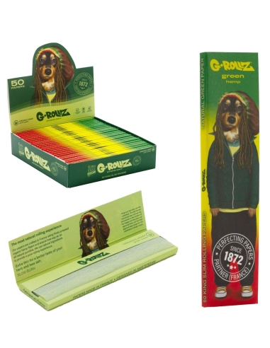Ungebleichte Papers in Kingsize-Grösse der Marke G Rollz, hergestellt in Frankreich aus fein gepressten grünen Hanffasern aus biologischem Anbau und Akaziensaft als natürlichem Gummi.