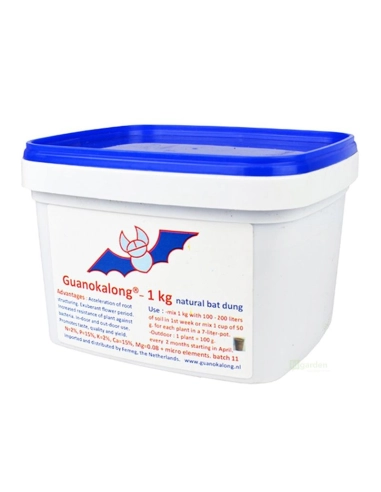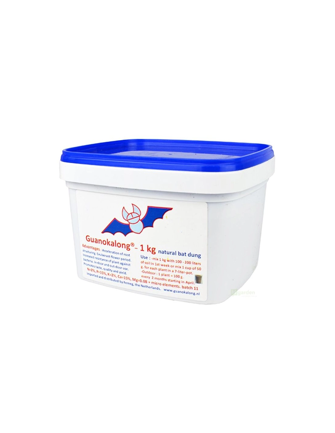 100% natürlicher Fledermaus-Dung für beispiellose Ergebnisse. Der perfekte Dünger, um Ihre Pflanzen zum Wachsen und Blühen zu bringen. Der super biologische ‘GuanoKalong’-Dünger verbessert den Geschmack, die Qualität und den Ertrag. Guano Kalong ist ein reines und ökologisches Produkt, das in Handarbeit aus indonesischen Grotten gewonnen wurde. Die essentiellen Nährstoffe favorisieren die Entstehung und den Stoffwechsel der Wurzeln und erhöht die Resistenz der Pflanzen gegenüber Krankheiten. (N=2 %, P2O5=15 %, K2O=2 %, S=0,2 %, Ca/Mg=15 %, mg/kg Cu=15, Zn=20, Cl=100). Guano Kalong als Granulat eignet sich ideal zur Vorbereitung der Erde. Seine langsame Auflösung versorgt die Pflanze anhaltend mit den notwendigen Nährstoffen in der Wachstums- und Blütezeit. 1 kg Guanokalong reicht für 200 bis 250 Liter Erde (50g pro Pflanze in einem Topf von 6-7 Liter). Mischen Sie Guano mit der Erde innerhalb der ersten Woche, in 10-12 Wochen wird er sich vollständig aufgelöst haben. Für den Außenbereich: 100g pro Pflanze alle 2 Monate.