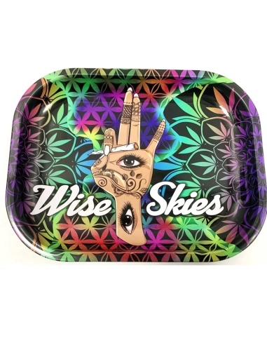 Mischbrett aus Metall der Marke Wises Skies in den Massen 14 x 18 cm mit der fantasievollen Abbildung einer weiblichen Hand, die einen Joint hält, mit Henna-Tattoos und Augen verziert und von bunten Cannabisblättern umgeben ist.