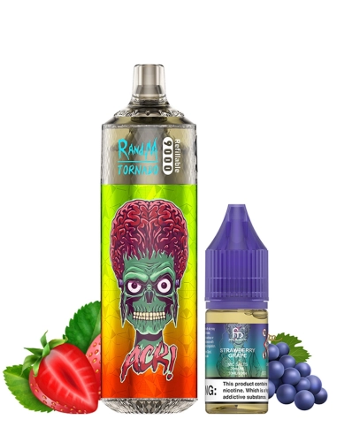 Diese neuen Tornado 9000 werden mit einem 10ml-Tank und einer 10ml-Flasche Fumot RandM Tornado Liquid mit 2% Nikotinsalz geliefert, aber Sie können eine zweite 10ml-Flasche separat kaufen, um Ihren Puff wieder vollständig zu füllen, wenn er leer ist, und so etwa 9000 Züge zu genießen.