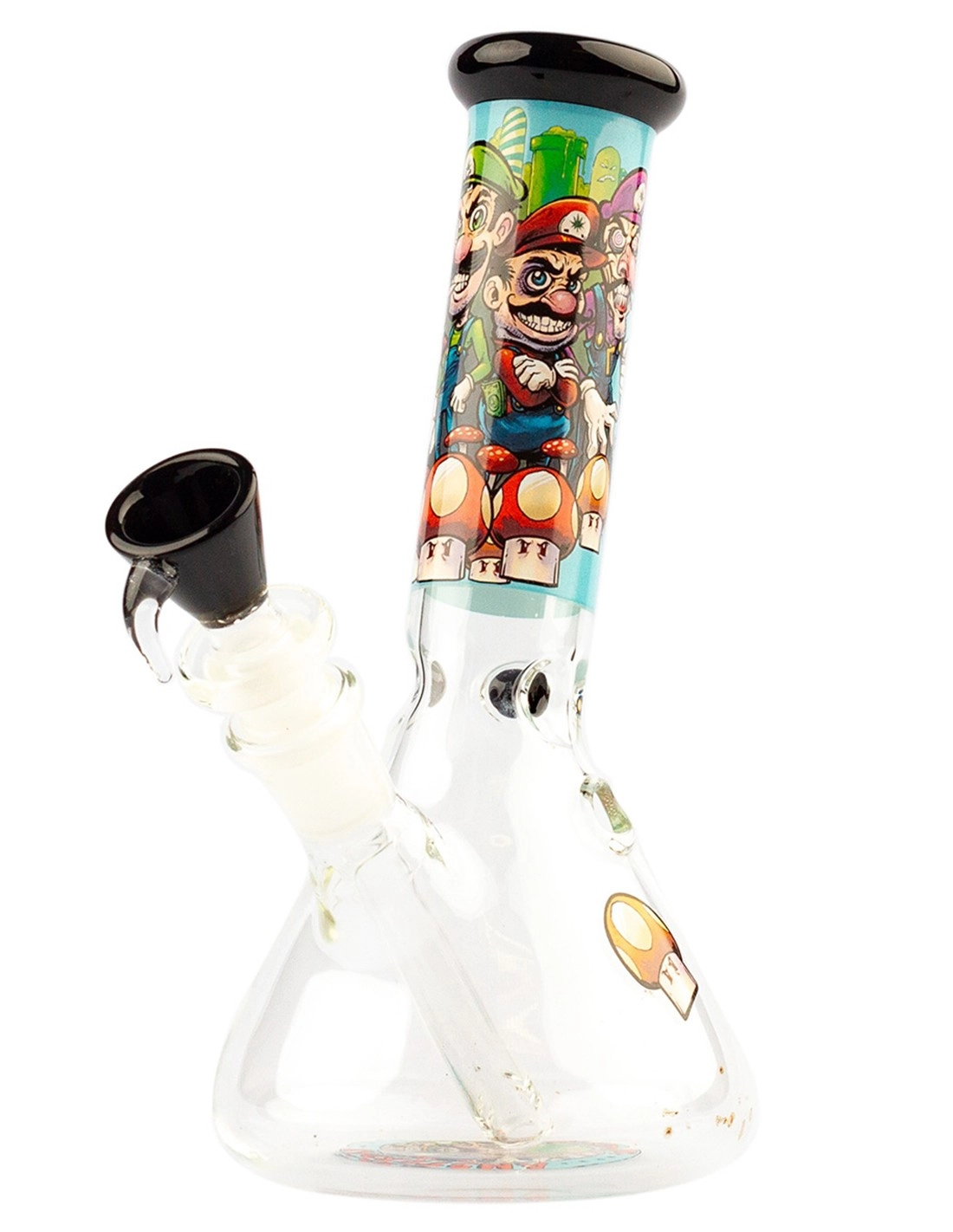 Glas-Bong der Marke Grace Glass in limitierter Auflage mit den Figuren aus dem Spiel Mario Bros. Diese Bong ist 25 cm hoch und misst 38 cm im Durchmesser. Zudem ist sie mit einem seitlichen Kickloch ausgestattet, um den restlichen Rauch, der sich in der Bong gesammelt hat, mit einem Mal zu inhalieren. Je nach Geschmack finden hier auch Eiswürfel Platz, um den Rauch zu kühlen.