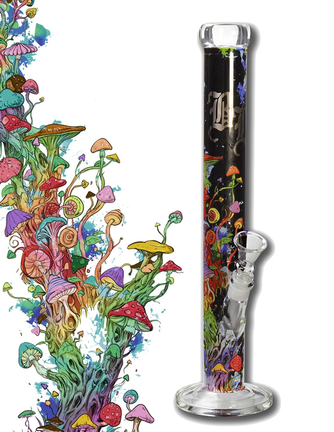 Exquisite Glasbong MUSHROOM TREE von Black Leaf® mit faszinierendem All-Over-Print, exklusiv für uns designed von SLY. Hergestellt ist die straighte Zylinderbong aus 5mm starkem Borosilikatglas-Rohr. Daher ist die Bong robust, schwer und sehr standfest.