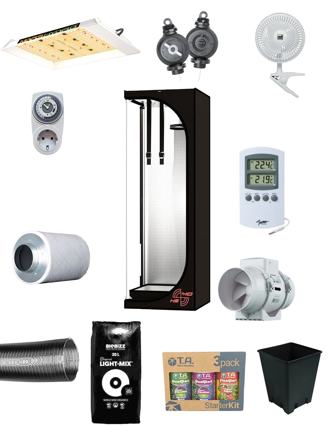 Indoor-Grow-Set mit den Maßen 40 x 40 x 120cm mit einem Mars Hydro TS-600 LED-Panel sowie allen notwendigen Materialien, um Ihre Pflanzen bis zur Ernte zu kultivieren.