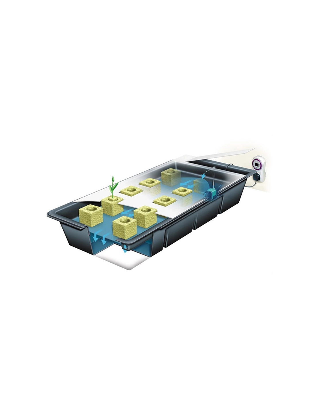 Die Pflanzen werden in Steinwolleblöcke gesetzt und die Wurzeln wachsen entlang des Pflanzkanals. Die Nährlösung wird ständig aus dem Wassertank zu den Wurzeln gepumpt, ohne dass eine Zeitschaltuhr programmiert werden muss. Da praktisch kein Nährmedium verwendet wird, gibt es am Ende der Saison fast nichts zu entsorgen.