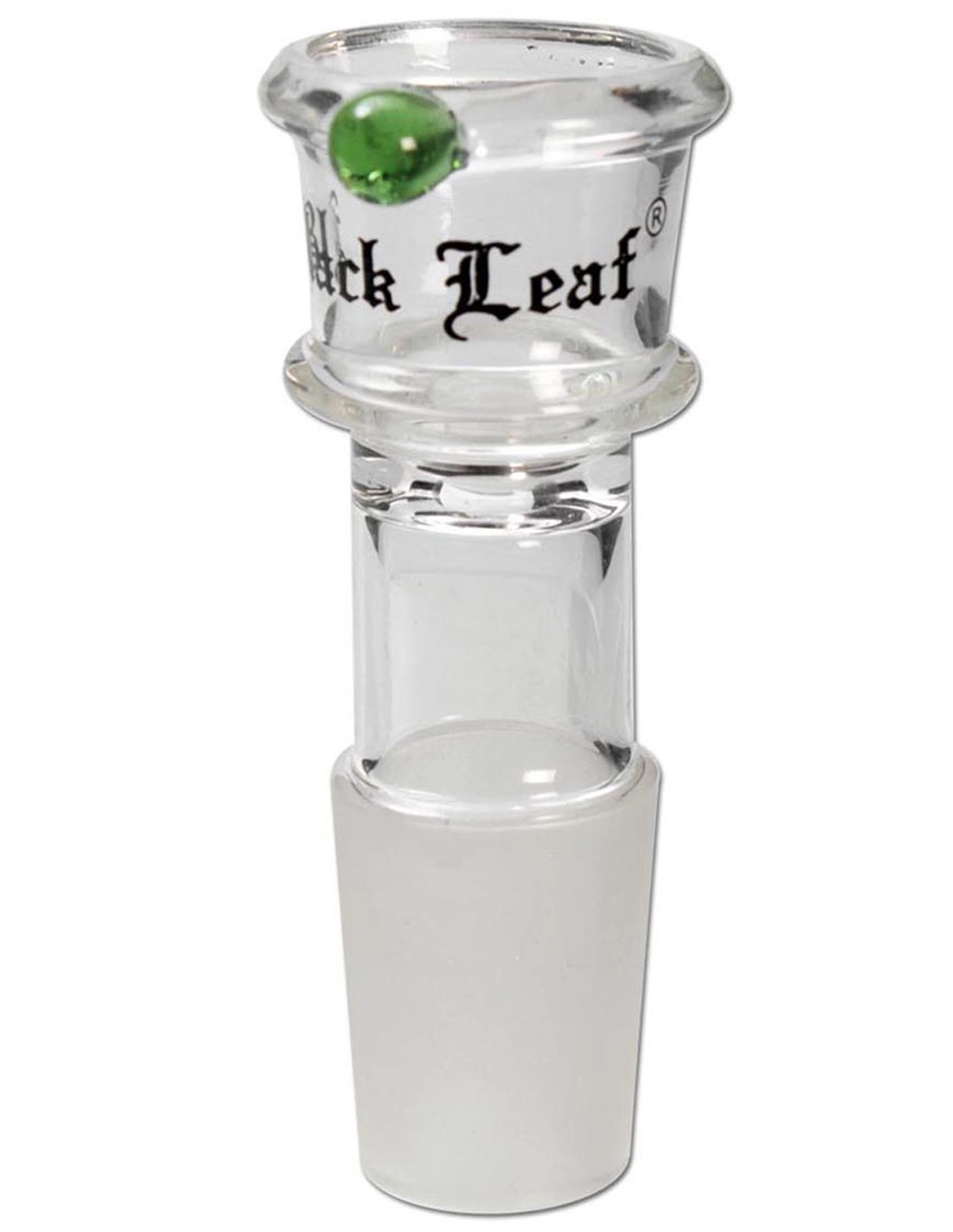 Zylindrischer Glaskopf der Marke Black Leaf in der Größe L, mit einem Verbindungsstück von 18 mm auf Höhe des sandgestrahlten Bereichs und einem inneren Durchmesser von 20 mm auf Höhe des Köpfchens.