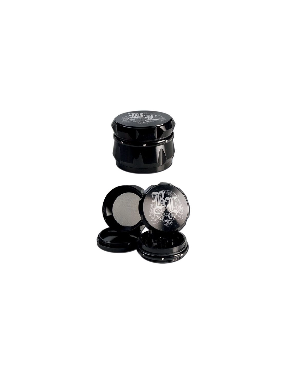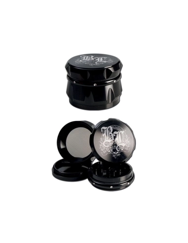 4-teiliger Grinder in Kronenform der Marke "Black Leaf" aus schwarzem Metall, mit Auffangsieb.