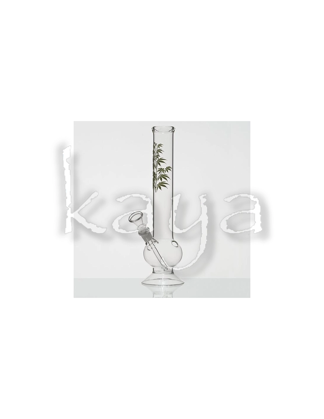 Bong aus durchsichtigem Glas mit grünem Cannabis-Motiv. Höhe: 30 cm, Ø 40 mm.