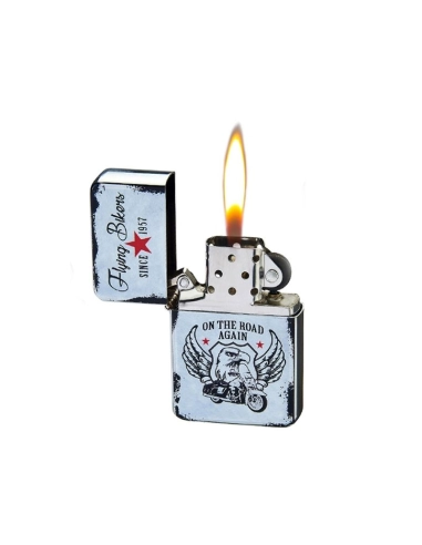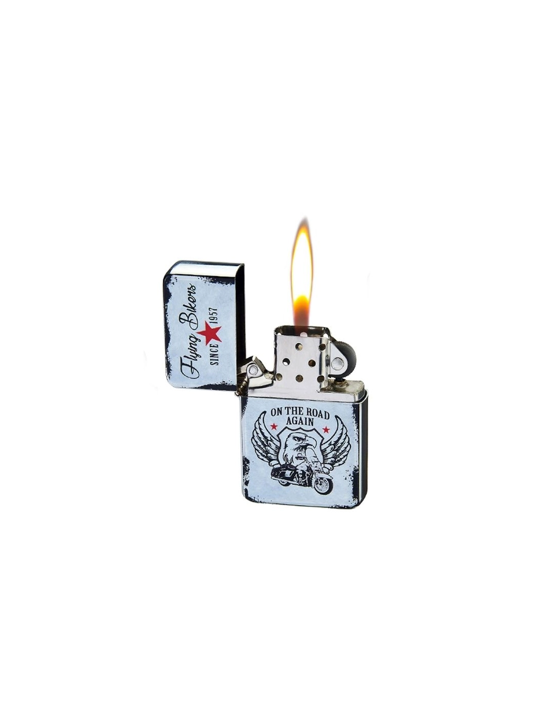 Nachfüllbares Benzinfeuerzeug aus Metall mit dem Bild eines Motorrads und Flügel.
