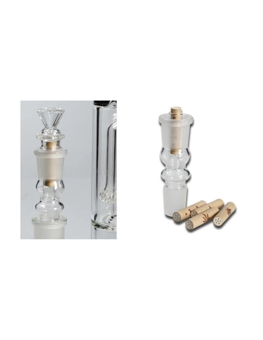 Dieser Bongadapter aus hitzebeständigem Borosilikatglas, passend auf alle Pfeifen mit 18,8mm Normschliff, wird inklusive 5x8mm Standard-Aktivkohlefilter der Marke 'lol' geliefert.